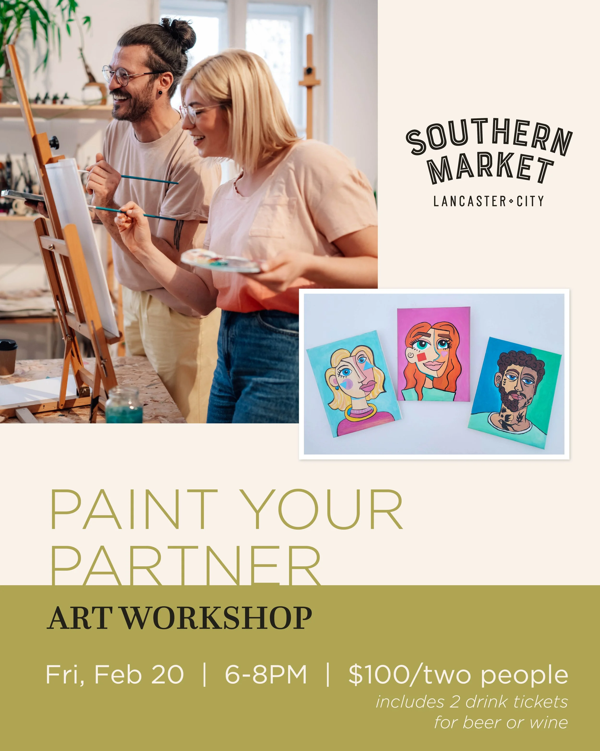 Paint, sip, and laugh your way through a creative night out at Southern Market! Join us on Friday, February 20, from 6-8PM for an evening where couples, friends, or family take turns painting one another—no art experience required. This workshop is intentionally not about realism or perfection but all about bold colors, expressive shapes, and having fun.