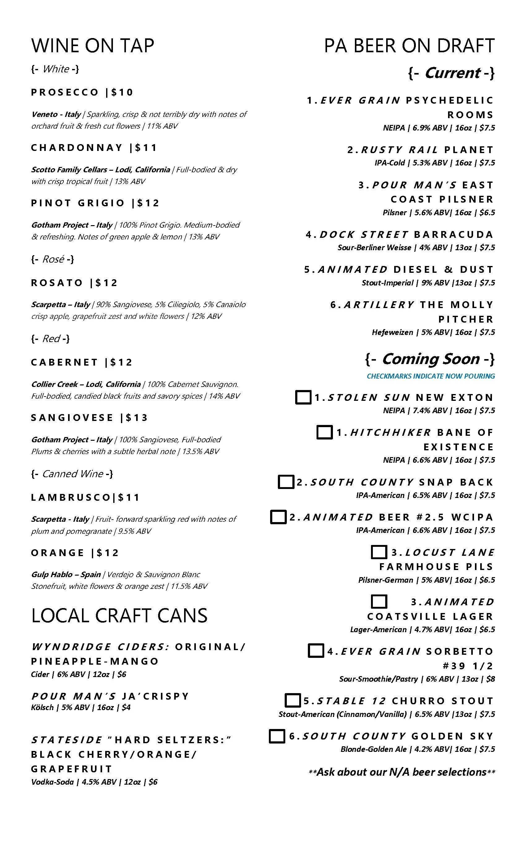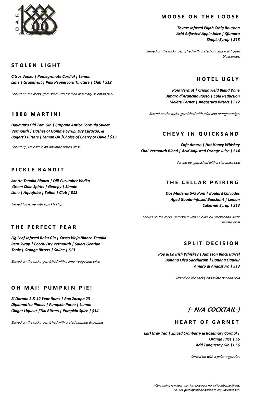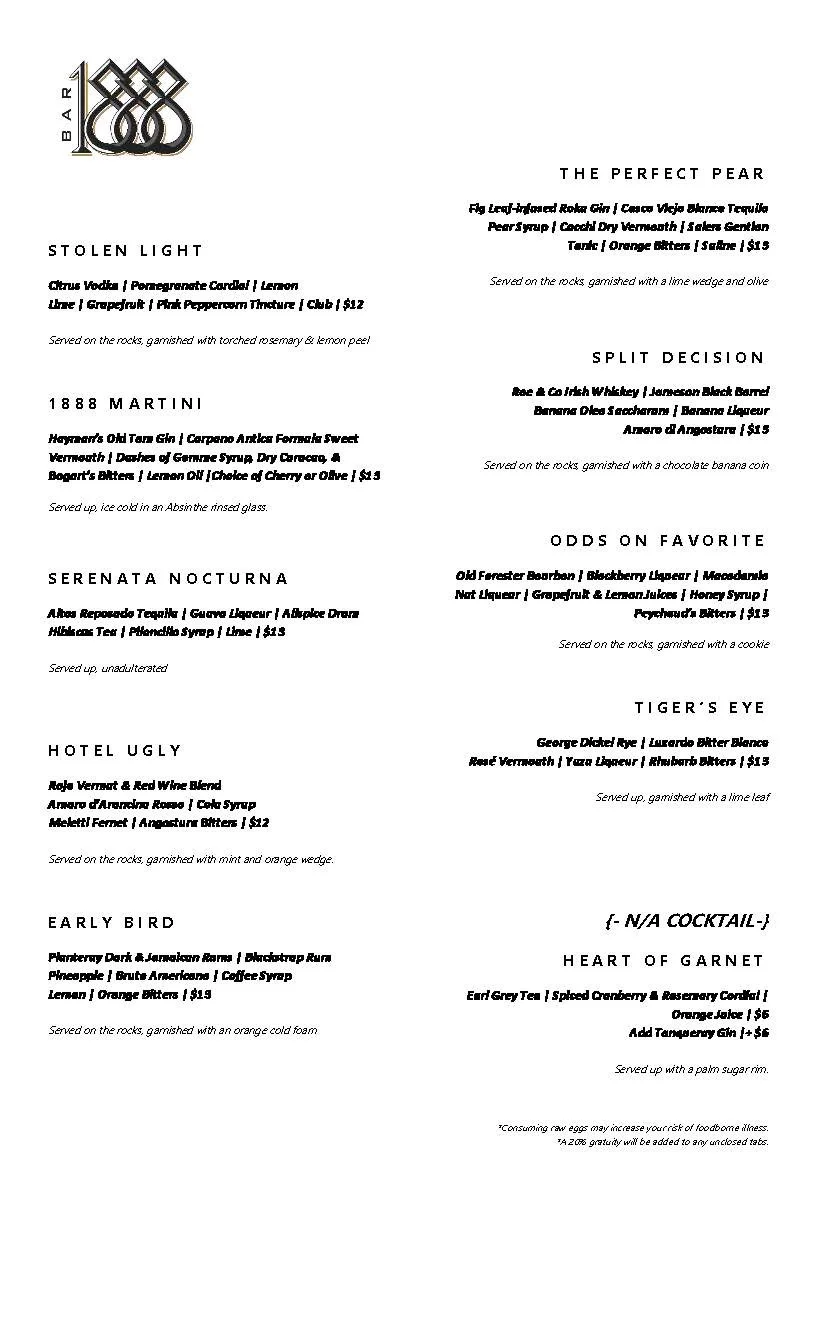 Bar 1888 MenuThe Bar 1888 menu changes frequently. See the current offering here. Bar 1888 Menu Page 1 Bar 1888 Menu Page 2